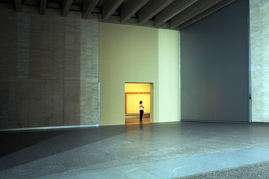 Vista sobre paredes vazias e apenas com uma abertura para outra sala, onde uma mulher está olhando ao longe. A luz da primeira sala resultou azulada e a da segunda ficou amarelada