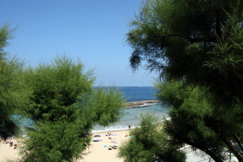 Paisagem da praia vista por entre a copa de árvores. Um barco ao longe no marLargo pedonal na marginal de Santander. Uma árvore ao centro, algumas pessoas a passear e a observar a paisagem