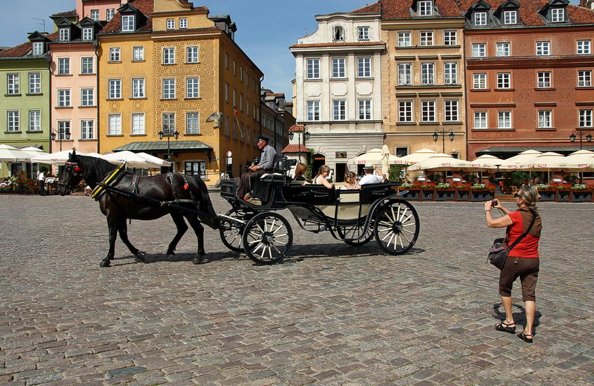 Uma Charrete com turistas a atravessar a praça e um mulher a tirar- lhe uma fotografia. Ao fundo os edifícios e as esplanadass